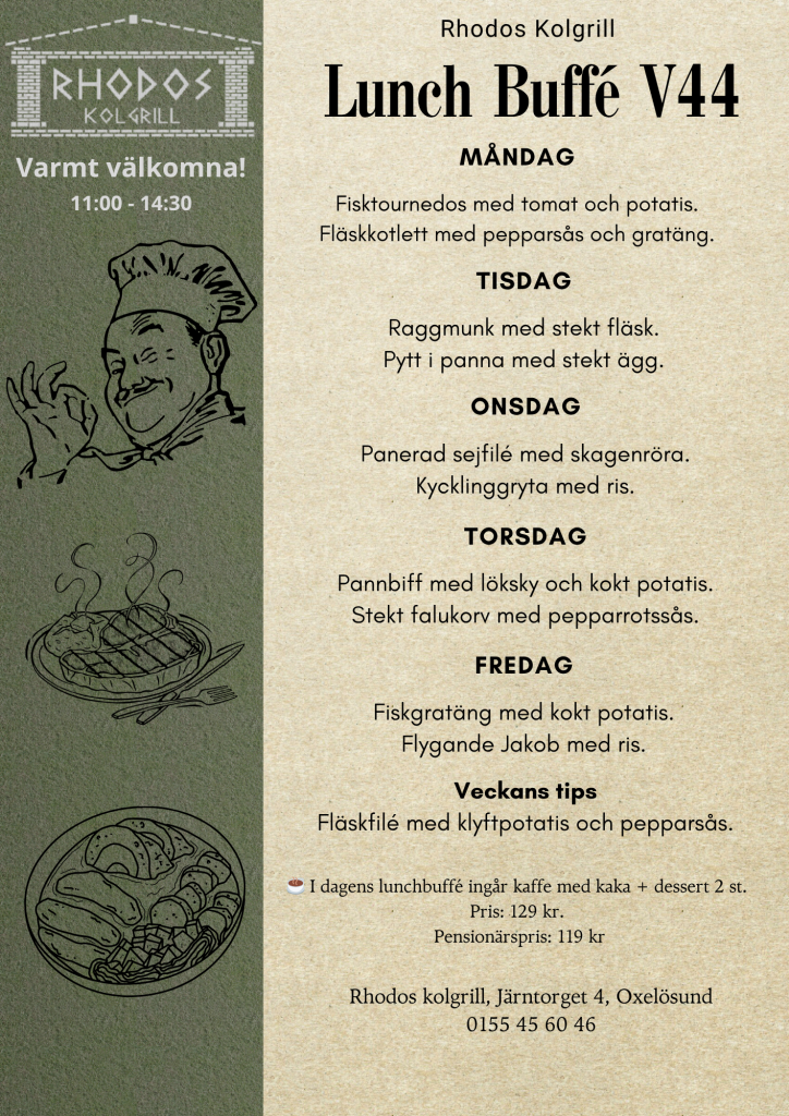 Välkommen till Rhodos Grekiska Kolgrillen! Vi är en restaurang i Oxelösund som serverar mat av hög kvalitet till rimliga priser.